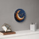 Das Bild zeigt einen wunderschön beleuchteten Halbmond, der mit funkelnden Lichtern geschmückt ist. Der Mond wird vor einem tiefen, blau strukturierten Hintergrund platziert und schafft so ein nächtliches Himmelsambiente. Vom Mond hängen mehrere kleine, leuchtende Sterne, die jeweils die gleiche goldene Farbe widerspiegeln. Der Effekt ist magisch und skurril und erinnert an eine ruhige Nachtszene, die mit funkelnden himmlischen Elementen gefüllt ist.