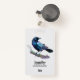 Ein Namensschild mit einer schönen Wasserfarbe, die von einer Krähe zeichne. Dunkelblau und lebendige lila Farben unterstreichen die Schönheit dieses Vogels.