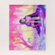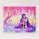 Ein wunderschöner Ritter mit blauen Haaren in einem Mantel und einer Rüstung hat auf einem Knie gekrönt und steht unter einer großen blühenden Weide in einem magischen Wald. Sie hat ein Schwert in den Händen und ist bereit zu kämpfen. Das goldene Licht leuchtet ihr auf. Ein Pferd weidet in der Ferne zwischen den Bäumen.