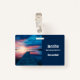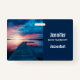Namensschild mit einem wunderschönen Foto. Ein landschaftlicher Ort. Ein schöner ruhiger See mit einem Holzsteg, der sich nach außen erstreckt. Sonnenuntergang sorgt für schöne Farben am Himmel, lebendiges Rot und Blau.