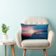 Ein Kissen mit einem herrlichen Foto. Ein landschaftlicher Ort. Ein schöner ruhiger See mit einem Holzsteg, der sich nach außen erstreckt. Sonnenuntergang sorgt für schöne Farben am Himmel, lebendiges Rot und Blau.