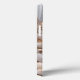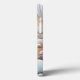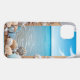 Ein digitales Bild zeigt eine Strandlandschaft, die von Muscheln und weißen Vorhängen gerahmt ist. Die Aussicht ist von einem hellblauen Ozean unter einem klaren Himmel mit verstreuten weißen Wolken. Das Wasser überwindet sich von tiefblau am Horizont zu einem helleren, türkisblauen Ufer, wo sanfte Wellen einen schmalen Rand bilden. Der Rahmen des Bildes besteht aus hellbraunen Holzplanken auf beiden Seiten, die mit verschiedenen Muscheln in Weiß-, Creme- und Hellblau geschmückt sind. Die Muscheln sind in einem dekorativen Muster angeordnet, das der Komposition ein Wasserthema verleiht. Von der Oberseite der Holzplanken hängen weiße Vorhänge, die mit einfachen Knoten verbunden sind und der Szene eine sanfte, elegante Touch verleihen. Der Gesamtstil erinnert an ein Reiseplakat oder ein dekoratives Stück, mit einem Fokus auf hellen, einladenden Farben und einer sauberen, stilvollen Ästhetik. Die Beleuchtung ist weich und verbreitet, was die ruhige und einladende Atmosphäre der Strandlandschaft unterstreicht.