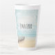 Latte Tasse mit einem schönen rustikalen Bild. Feine Farben von hellblau, sandig braun und sanft weiß. Eine Strandlandschaft mit einem Boot am Ufer mit einem Fischernetz, das an der Seite hängt. Ein eleganter, schäbiger Look.