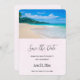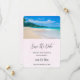 Save the Date Karte mit einem Foto eines wunderschönen Urlaubsortes. Hellblauer Himmel, sanfter Sandstrand mit kristallklarem Wasser. Ein üppig bedeckter Berg im Hintergrund. Landschaftliche und ruhige Fotografie.