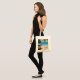 Eine Leinwand Tote Tasche mit einer idyllischen tropischen Strandszene. Türkisblaues kristallklares Wasser und ein sanfter brauner Sandstrand. Einige Blätter aus Palmen hängen von oben herab. Ein altes Holzboot sitzt am Strand. Eine ruhige und friedliche Landschaft.