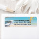 Adressieren Sie Labels mit einer idyllischen tropischen Strandszene. Türkisblaues kristallklares Wasser und ein sanfter brauner Sandstrand. Einige Blätter aus Palmen hängen von oben herab. Ein altes Holzboot sitzt am Strand. Eine ruhige und friedliche Landschaft.