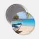 Ein Magnet mit einer idyllischen tropischen Strandszene. Türkisblaues kristallklares Wasser und ein sanfter brauner Sandstrand. Einige Blätter aus Palmen hängen von oben herab. Ein altes Holzboot sitzt am Strand. Eine ruhige und friedliche Landschaft.