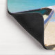 Ein Mousepad mit einer idyllischen tropischen Strandlandschaft. Türkisblaues kristallklares Wasser und ein sanfter brauner Sandstrand. Einige Blätter aus Palmen hängen von oben herab. Ein altes Holzboot sitzt am Strand. Eine ruhige und friedliche Landschaft.