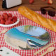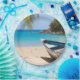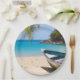 Papierteller mit idyllischer tropischer Strandlandschaft. Türkisblaues kristallklares Wasser und ein sanfter brauner Sandstrand. Einige Blätter aus Palmen hängen von oben herab. Ein altes Holzboot sitzt am Strand. Eine ruhige und friedliche Landschaft.