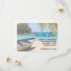 Hochzeit speichern Sie die Dattelkarten mit einer idyllischen tropischen Strandszene. Türkisblaues kristallklares Wasser und ein sanfter brauner Sandstrand. Einige Blätter aus Palmen hängen von oben herab. Ein altes Holzboot sitzt am Strand. Eine ruhige und friedliche Landschaft.