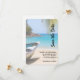 Hochzeit speichern Sie die Dattelkarten mit einer idyllischen tropischen Strandszene. Türkisblaues kristallklares Wasser und ein sanfter brauner Sandstrand. Einige Blätter aus Palmen hängen von oben herab. Ein altes Holzboot sitzt am Strand. Eine ruhige und friedliche Landschaft.