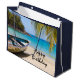 Eine Geburtstagsgeschenktasche mit einer idyllischen tropischen Strandszene. Türkisblaues kristallklares Wasser und ein sanfter brauner Sandstrand. Einige Blätter aus Palmen hängen von oben herab. Ein altes Holzboot sitzt am Strand. Eine ruhige und friedliche Landschaft.