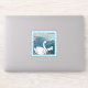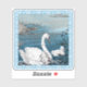 Dieser Vinyl-Aufkleber hat einen schönen weißen Schwan in einem See mit ihrem Baby Schwan mit Bäumen im Hintergrund in einem extravagant hellblauen Rahmen.
