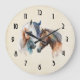 Eine Uhr mit einer schönen Wasserfarbe zeichnend. Mit einem Paar Pferde, braun und weiß. Kopf und Hals sichtbar mit tropfender Farbe entlang der Nackenbasis. Südwestvibe.