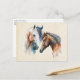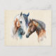 Eine Postkarte mit einer schönen Aquarellfarbe zeichnend. Mit einem Paar Pferde, braun und weiß. Kopf und Hals sichtbar mit tropfender Farbe entlang der Nackenbasis. Südwestvibe.