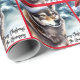 Diese Winterszene hat einen wunderschönen Wolf, der eine Weihnachtsmannmütze im Schnee trägt.
