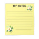 Ein hellgelbes Notizblock mit schwarzen vertikalen Linien und eine Abbildung zeigt eine schöne Blume als Aquarellmalerei in der oberen und unteren links Ecke.