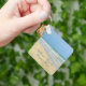 Wunderschöner Strandhaus Schlüsselanhänger mit herrlicher Küstenfotografie mit einem hübschen Sandpiper stehend am Ufer der Ozeanwellen an einem sonnigen Sommertag. Am sandigen Ufer rollen hübsch blaue grüne Wellen, wo Ihr Name in niedlicher blauer Typografie personalisiert ist. Eine wunderschöne tropische Insel Zuhause Geschenk.