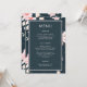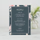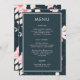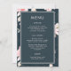 Das schöne, blumengeschmückte klassische Hochzeitsmenü ist mit einem zarten botanischen Muster aus rot-rosa Blume und einem dunkelblauen Hintergrund versehen.