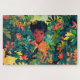Dieses Puzzle aus Gartenkunst besticht durch einen braunhäutigen Jungen mit lockig schwarzem Haar, umgeben von farbenfrohen tropischen Pflanze. Es wäre ein wunderschönes Geschenk für einen Puschenliebhaber.
