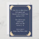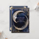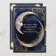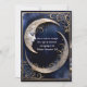 Ein schönes und ruhiges Gesicht in einem Halbmond, in einem goldenen Rahmen auf dunkelblauem Gradientenhintergrund, ist eine exquisite Halloween-Party-Einladung. Die Rückseite ist in einem Blautönen gehalten, mit einem weißen goldfarbenen Rahmen und mondfarbenen Halbmonden an den Ecken und viel Platz für zusätzlichen Text.