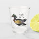 Eine schöne Holzente. Die Abbildung wird von der Seite mit einer schwarzen Wasserwelle aus den Federn des Schwanzes gemacht.