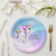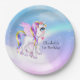 Papier Teller mit einem Einhornbild mit großen blauen Augen, rosa Flügeln und Regenbogenmane und Schwanz. Kawaii niedlich.