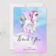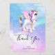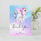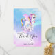 Vielen Dank Karte mit einem Bild eines Einhorns mit großen blauen Augen, rosa Flügeln und einem Regenbogenmane und Schwanz. Kawaii niedlich.
