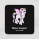 Visitenkarten mit einem Einhornbild mit großen blauen Augen, rosa Flügeln und Regenbogenmane und Schwanz. Kawaii niedlich.