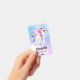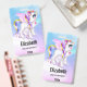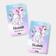 Personalisiertes Namensschild mit einem Einhorn mit großen blauen Augen, rosa Flügeln und Regenbogenmane und Schwanz. Kawaii niedlich.