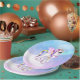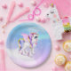 Papier Teller mit einem Einhornbild mit großen blauen Augen, rosa Flügeln und Regenbogenmane und Schwanz. Kawaii niedlich.