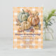 Feiern Sie die Saison mit diesem gemütlichen Herbst-Design mit drei Kürbissen in Salbeigrün, Beige und Creme, umgeben von Herbstlaub. Der warme orange-weiße karierte Hintergrund verleiht einen rustikalen Farmhouse-Touch, perfekt für Thanksgiving-Dekorationen, Einladungen oder saisonale Geschenke. Eine charmante Art, mit herbstlichem Stil "Happy Thanksgiving" zu sagen!