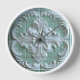 Die Uhr hat einen Prägung aus weißer Keramik, elegante Blumenziegel auf hellgrünen Hintergrund Fliesen Wand.