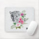Ein Mauspad mit einer schönen Abbildung mit einem grauen, schwarz-weißen Leopardenportrait. Dieses hübsche Tier ist von einer tropischen Blume umgeben. Elegant, exotisch und schön.
