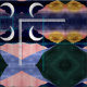Moderne metallische goldene Sonnenuntergänge und silberglühende Mondlandschaft künstlerisches Design, mit einem phantastischen, weiß und silber leuchtenden Halbmond, Imitate metallische Goldsonne, rosa und dunkelblaue Abend Farbenfarben Himmel mit leuchtenden weißen Sternen und Sternenstaub, grüne Berge, rosa Berge, dunkelblaue Berge und eine weiche, pulblauen Fluss atemberaubend Illustration. Minimalistische boho Natur Landschaft ästhetische Kunst.