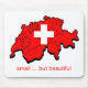 Rote Karte von der Schweiz mit dem weißen Schweizer kreuzen vorbei es. Art sagt darunterliegend "kleines… aber schön". Eine sehr gute Weise, die Auswirkung des Landes. .a lot of für die Größe zu beschreiben.