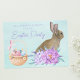 Ein wunderschöner Osterhase liegt hinter einem herrlichen Bouquet lila und aquamariner Blume auf einer hübschen, pastellfarbenen aquamarinen Aquarell-Party Einladung mit personalisiertem Lavendel-Drehbuch Ihres Familiennamen unter Happy Oaster. Chic, hübsche Ostereierjagd oder Brunch laden ein.