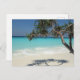 Eine Postkarte mit einem schönen und ruhigen Foto. Türkisblaues, tropisches Meer mit weißem Sand. Ein Solo-Tropenbaum lädt zum Entspannen und Genießen dieses landschaftlichen, idyllischen Ortes ein.