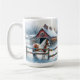Weihnachtskaffee-Tasse. Hübsches gepunktetes Pferd in Braun und Weiß auf einem rustikalen Bauernhof mit festlichen Weihnachtsdekorationen.