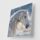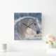 Ein schönes, weißes Pferd im Schnee mit fließender Mähne. Eine hübsche Uhr zum Thema Pferde