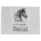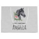 Eine Geburtstagsgeschenktüte mit einer schönen Abbildung eines schwarzen Pferdekopfes mit einer extravaganten Blumenverzierung am Hals. Elegante und klassische Tiermalerei. Grauer Hintergrund.
