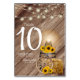 Schönes rustikales Holzfass und Sonnenblumen Tischnummer