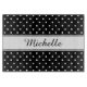Dieses klassisch gestaltete Schneidbrett ist mit einem schwarz-weißen Polka-Punktmuster-Hintergrund versehen. In der Mitte ist eine Vorlage, um Ihren Namen in schönen kursiven schwarzen Schriftart personalisieren. Vorlagen, die leicht zu bedienen sind, machen die Anpassung zu einem Kinderspiel. Ein personalisiertes Geschenk für ein frisch verheiratetes Paar, Brautparty oder als Erwärmung. Polka-Punkte erstellt von: AMBillustrations http://www.etsy.com/shop/AMBillustrations