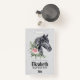 Personalisiertes Abzeichen mit einer schönen Abbildung eines schwarzen Pferdekopfes mit einer extravaganten Blumenverzierung am Hals. Elegante und klassische Tiermalerei. Grauer Hintergrund.