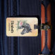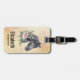 Personalisierter Gepäckanhänger mit einer schönen Abbildung eines schwarzen Pferdekopfes mit einer extravaganten Blumenverzierung am Hals. Elegante und klassische Tiermalerei. Der Hintergrund hat ein extravagant abstraktes Design in hellgelber Farbe mit Imitaten goldenen Flecken.