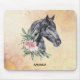 Mouse pad with a beautiful illustration of a black horse head with a fancy floral embellishment by it's neck. Elegant and classiy animal painting. The background has a fancy abstract design in a light yellow color with falsch gold flecks.