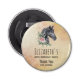 Geburtstagsfeier oder andere Veranstaltung danken Ihnen Flaschenöffner mit einer schönen Abbildung eines schwarzen Pferdekopfes mit einer extravaganten Blumenverzierung am Hals. Elegante und klassische Tiermalerei. Der Hintergrund hat ein extravagant abstraktes Design in hellgelber Farbe mit Imitaten goldenen Flecken.