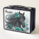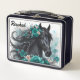 Schönes schwarzes Pferd mit aquamarinen Blume Lunch Box, bearbeiten Sie den Namen selbst, wenn Sie bestellen. Das gleiche Bild auf der Vorder- und Rückseite.