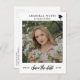 Schön minimalistischer Abschluss Save the Date Postkarte mit einem Foto und einem hübschen Skript. Fügen Sie den Namen des Absolventen und die Einzelheiten des Abschlusses in schwarzen Schriftart vor einem weißen Hintergrund.