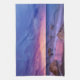 Ein Küchentuch mit einem hübschen Foto in lila, blauen und rosa Farbtönen bei Sonnenuntergang. Eine hübsche Küste mit Felsen.